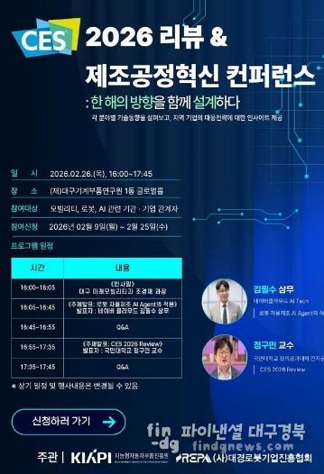 파이낸셜대구경북 기자 | 대구광역시는 2월 26일 오후 4시, 대구기계부품연구원 글로벌홀에서 ‘CES 2026 리뷰·제조공정혁신 컨퍼런스’를 개최한다.