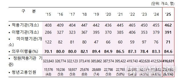 2025년 공공기관 청년고용의무 이행결과에 따르면, 적용기관 462개소의 84.6%(391개소)가 청년고용의무를 이행한 것으로 조사되어 2024년(83.3%, 379개소) 대비 1.3%p(+12개소) 증가했다.