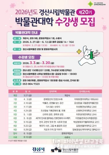 파이낸셜대구경북 기자 | 경산시립박물관은 올해 스무 돌을 맞이한 '제20기 박물관대학'의 수강생을 모집한다고 밝혔다.