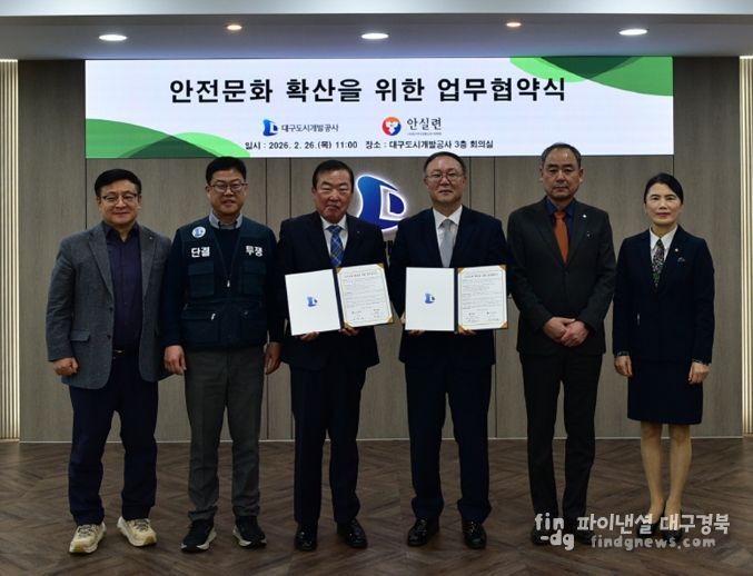 파이낸셜대구경북 김유신 기자 | 대구도시개발공사는 2월 26일 본사 회의실에서 (사)대구안전생활실천시민연합과 ‘안전문화 확산을 위한 업무협약’을 체결했다.