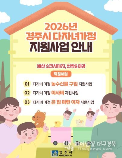 파이낸셜대구경북 기자 | 경주시는 다자녀 가정의 경제적 부담을 실질적으로 완화하고 안정적인 정주 기반을 강화하기 위해 ‘2026년 경주시 다자녀 가정 지원사업’을 3월부터 본격 시행한다고 밝혔다.