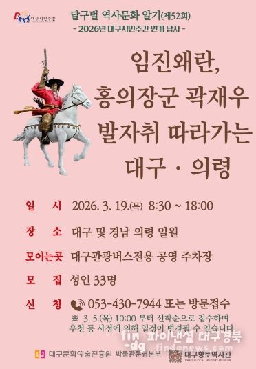 파이낸셜대구경북 김유신 기자 | 대구문화예술진흥원 박물관운영본부 소속 대구향토역사관은 2026년 대구시민주간 연계 프로그램으로 3월 19일에 ‘임진왜란, 홍의장군 곽재우 발자취 따라가는 대구·의령’ 답사를 개최한다.