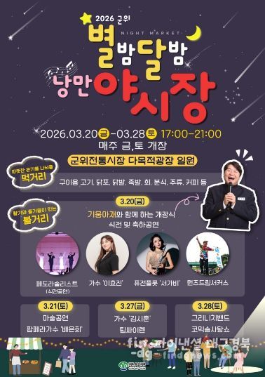 파이낸셜대구경북 기자 | 군위군은 전통시장에 활력을 불어넣고 군민과 방문객들에게 봄밤의 추억을 선사하기 위해 '군위전통시장 별밤달밤 낭만 야시장'을 오는 3월 20일 개장해 3월 28일까지 매주 금요일과 토요일 운영한다고 밝혔다.