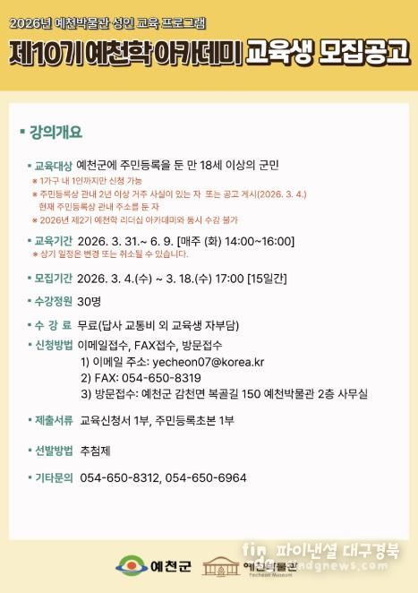 파이낸셜대구경북 김유신 기자 | 예천군은 2026년 상반기 ‘예천학 및 예천학 리더십 아카데미’ 교육생을 18일까지 모집한다.