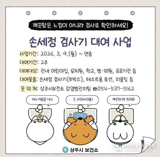 파이낸셜대구경북 기자 | 상주시보건소는 지역 어린이집, 유치원, 학교, 공공기관 등을 대상으로 올바른 손씻기 습관 형성과 감염병 예방을 위한 ‘손세정 검사기 대여 서비스’를 3월부터 연중 운영한다고 밝혔다.