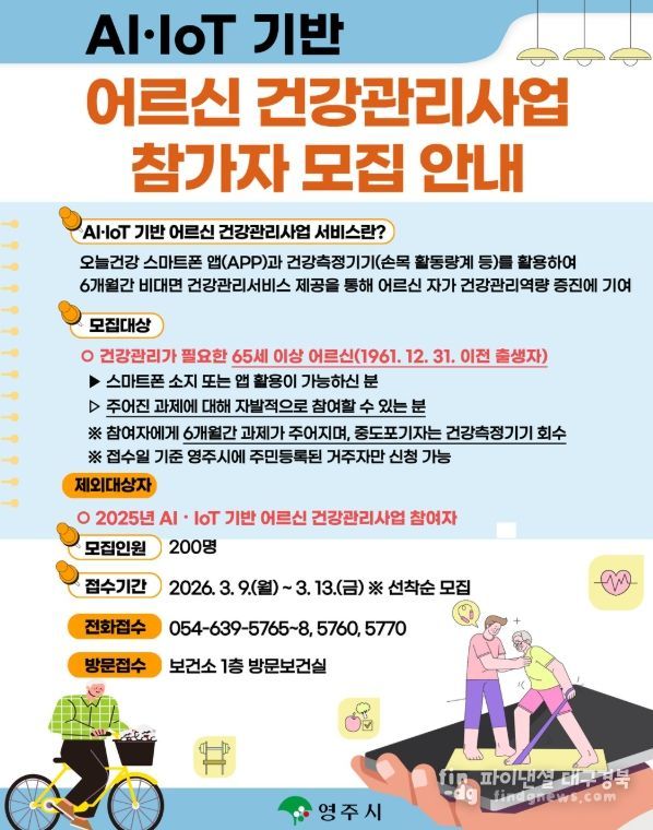 파이낸셜대구경북 기자 | 영주시는 오는 3월 9일부터 13일까지 ‘2026년 AI·IoT 어르신 건강관리사업’ 신규 참여자 200명을 선착순 모집한다.