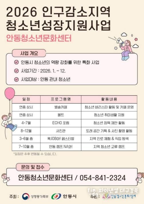 파이낸셜대구경북 기자 | 성평등가족부와 안동시가 지원하고 안동청소년문화센터가 주관하는 ‘2026 인구감소지역 청소년성장지원’ 사업이 지난해에 이어 2년 연속 운영된다.