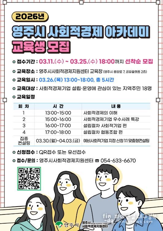 파이낸셜대구경북 기자 | 영주시와 영주시사회적경제지원센터는 신규 사회적경제기업 발굴 및 육성을 위해 '2026 영주시 사회적경제 아카데미' 교육생을 3월 11일부터 25일까지 모집한다.