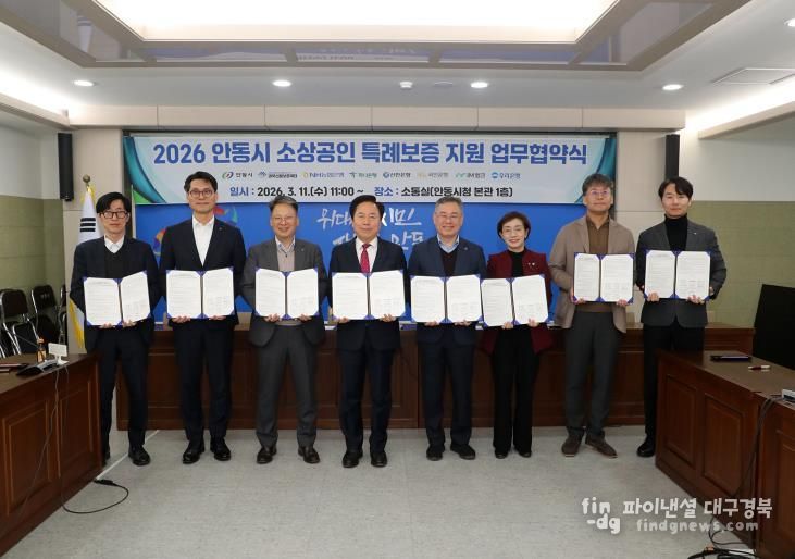 파이낸셜대구경북 김유신 기자 | 안동시는 3월 11일 시청 소통실에서 경북신용보증재단 및 6개 협약은행과 함께 '2026년 안동시 소상공인 특례보증 지원 업무협약'을 체결했다.