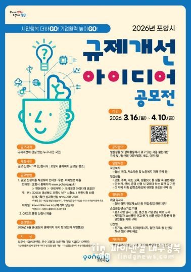 파이낸셜대구경북 기자 | 포항시는 일상생활과 경제활동에 불편을 주는 불합리한 규제를 시민과 함께 발굴하고 개선하기 위해 3월 16일부터 4월 10일까지 ‘2026년 포항시 규제개선 아이디어 공모전’을 개최한다.