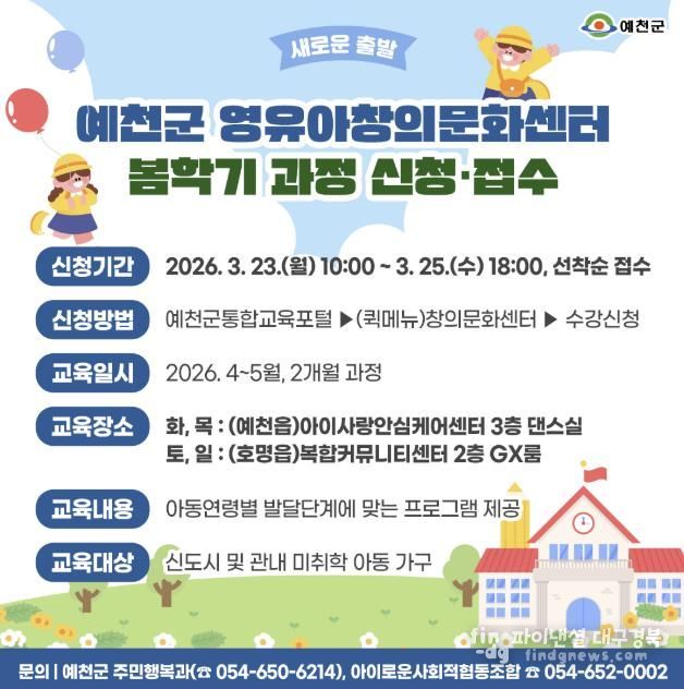 파이낸셜대구경북 기자 | 예천군은 관내 영유아의 건강한 성장과 창의력 발달을 지원하기 위해 예천군 영유아 창의문화센터 봄학기 프로그램 수강생을 모집한다.