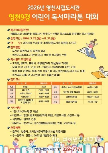 파이낸셜대구경북 기자 | 영천시 평생학습관(관장 정경자)은 3월 23일부터 8월 31일까지 초등학생들의 독서 활성화를 위해 ‘영천9경 어린이 독서마라톤 대회’를 운영한다.