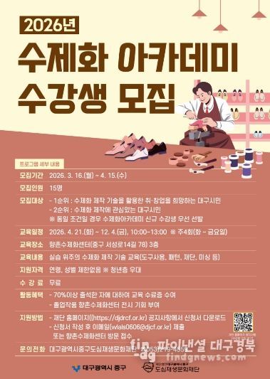 파이낸셜대구경북 김유신 기자 | 대구 중구는 오는 4월 15일까지 수제화 산업 전문 인력 양성을 위한 ‘2026년 수제화 아카데미’ 수강생을 모집한다.
