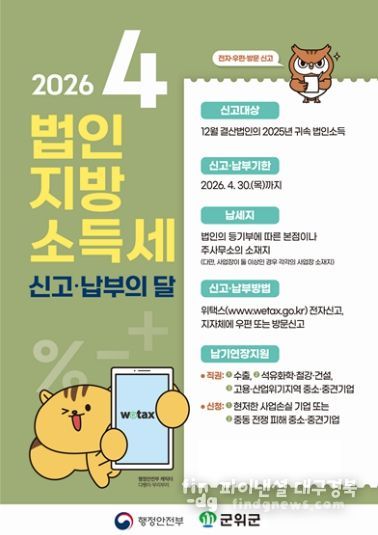 신고대상은 전년도 12월 결산법인으로, 2025년 귀속 법인소득에 대해 세무서에 신고하는 법인세와 별도로 법인지방소득세를 오는 4월 30일까지 군위군에 신고·납부해야한다.