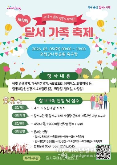 파이낸셜대구경북 기자 | 대구 달서구는 가족 간 소통과 지역 공동체 화합을 위해‘제13회 달서가족축제’참가자를 모집한다.