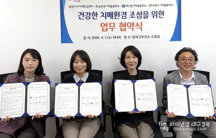 파이낸셜대구경북 김유신 기자 | 대구 달서구는 지난 1일 늘푸른기억돌봄학교, 대구샘기억돌봄학교, 상록수기억돌봄학교와 업무협약을 체결하고, 인지저하 및 경증치매 어르신을 위한 통합돌봄 체계 구축에 나선다.