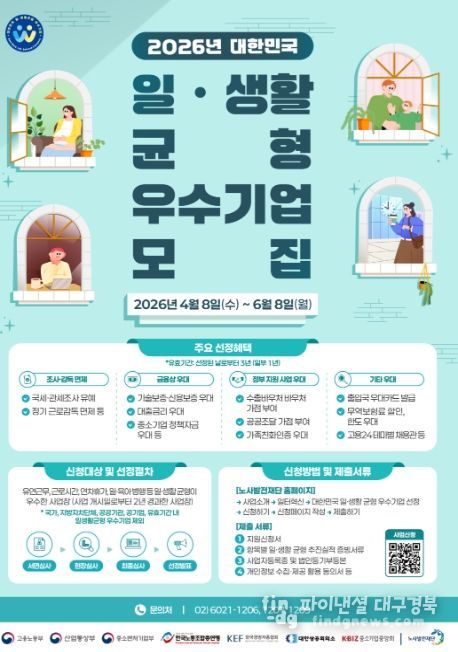 파이낸셜대구경북 기자 | 노동자의 일·생활 균형을 적극적으로 실천하는 기업이 인재 확보에 성과를 거두고 있다. 고용노동부는 이러한 우수사례 확산을 위해 산업통상부, 중소벤처기업부, 한국노동조합총연맹, 한국경영자총협회, 대한상공회의소, 중소기업중앙회와 함께 「대한민국 일・생활 균형 우수기업」을 4월 8일부터 모집한다고 밝혔다.