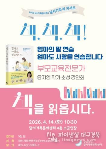이태훈 달서구청장은 “부모의 말과 태도는 아이의 정서와 성장에 큰 영향을 미치는 만큼 이번 북 콘서트가 가족 간 공감과 소통을 넓히는 뜻깊은 계기가 되길 바란다”며 “앞으로도 부모와 아이가 함께 성장할 수 있는 다양한 가족친화 프로그램을 지속적으로 확대해 나가겠다”고 밝혔다.