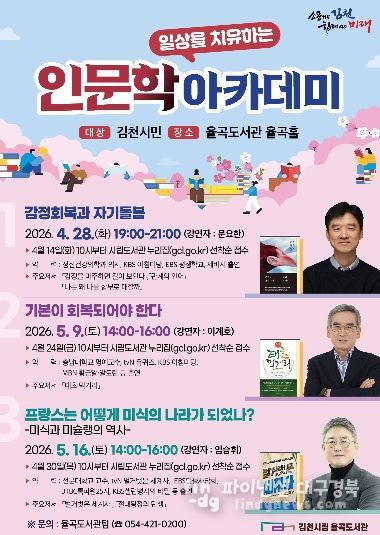 한편, 강연은 율곡도서관 율곡홀에서 진행되며 지역 주민 누구나 참여할 수 있다. 신청은 강연 회차별 일정에 맞춰 김천시립도서관 누리집을 통해 선착순으로 접수하면 된다.