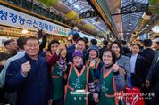 파이낸셜대구경북 김유신 기자 | 이재명 대통령은 30일 오후 제주 타운홀미팅 '제주의 마음을 듣다' 종료 후, 김혜경 여사와 함께 1박 2일 제주 일정의 마지막 일정으로 동문시장을 방문했다. 동문시장은 제주시 도심에 위치한 대표적인 전통시장으로, 대통령 부부의 방문 소식에 상인들과 방문객들은 놀라움 속에 환호와 박수로 이들을 맞이했다. 입구에 서 있던 한 외국인 관광객은 어디서 왔냐는 이 대통령의 질문에 “오스트레일리아”고 답하기도 했다. 이 대통령 부부는 셀카촬영과 악수를 이어가며 과일모찌 가게에 들러 온누리상품권으로 한라봉모찌와 딸기모찌를 구입해 즉석에서 강유정 대변인, 하정우 수석 등과 함께 시식했다. 이동 내내 이어지는 셀카요청에도 이 대통령 부부는 반갑게 응했다. 그러자 시장을 찾은 많은 도민들은 이동 중인 이 대통령 부부를 향해 "사랑해요", "와 대박", "화이팅"을 외치는 소리로 화답했다. 이 대통령은 특히 어린이들의 사진 요청에 적극적으로 답했다. "애기 있어요"라는 소리가 들리면 발걸음을 멈추고 아이들과 하이파이브를 하거나 반갑게 셀카를 찍었다. 또한 강아