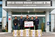 파이낸셜대구경북 기자 | 영주시는 지난 16일 ㈜예천친환경급식센터(대표 신규용)가 영주시청을 방문해 소면 300kg(81만 원 상당)을 기탁했다고 밝혔다. 이날 기탁식에는 ㈜예천친환경급식센터 신규용 대표와 유정근 영주시장 권한대행이 참석해 나눔의 의미를 함께 나누며 감사의 뜻을 전했다. 특히 이번 기부는 ‘희망2026 나눔캠페인’에 현물 기부로 참여한 것으로, 연말을 맞아 지역사회에 따뜻한 온기를 전하는 데 의미를 더했다. 이번에 기탁된 소면은 관내 경로식당과 장애인복지시설 등 지역 내 취약계층 이용 시설 16개소에 전달될 예정이다. 신규용 대표는 “연말을 맞아 지역 어르신들과 복지시설 이용자분들께 조금이나마 도움이 되고자 기탁을 결정했다”며, “앞으로도 지역과 함께 성장하는 기업으로서 지속적인 나눔 활동에 동참하겠다”고 말했다. 유정근 영주시장 권한대행은 “어려운 이웃을 위해 따뜻한 손길을 보내주신 ㈜예천친환경급식센터 신규용 대표께 깊이 감사드린다”며, “희망2026 나눔캠페인 참여를 통해 지역사회 전반에 따뜻한 연말 분위기 확산에 큰 힘이 되고 있다”고 밝혔다. 영주시