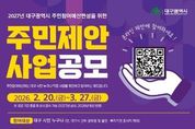파이낸셜대구경북 김유신 기자 | 대구광역시는 시민의 목소리를 시정에 직접 반영하기 위해 2월 20일부터 3월 27일까지 36일간 ‘2027년도 예산편성을 위한 주민제안사업’을 공모한다. 이번 공모 규모는 총 140억 원 규모로, 공모 분야는 ▲시정 참여형(70억 원) ▲구·군 참여형(40억 원) ▲읍·면·동 참여형(30억 원) 등 총 3개 부문으로 나뉜다. 대구 시민은 물론 대구 소재 직장인과 학생이라면 누구나 참여할 수 있다. 다만, 대구시와 구·군 공무원 및 산하 출연·투자기관에 종사하는 사람은 제외된다. 제안은 주민참여예산 누리집과 이메일, 팩스, 우편 및 방문 접수를 통해 가능하다. 대구시는 참여자 가운데 추첨을 통해 모바일 상품권을 지급하며, 향후 투표를 통해 우수사업으로 선정된 제안자에게는 대구광역시장 표창을 수여할 계획이다. 접수된 사업은 사업부서 검토와 주민참여예산위원회의 숙의·심사, 주민투표 및 총회 승인을 거쳐 선정되며, 시의회 예산심의·의결을 통해 2027년 주민참여예산 사업으로 최종 확정된다. 한편, 대구시는 지난해 주민제안사업 공모를 통해 ▲불로고
